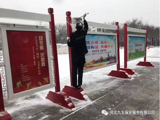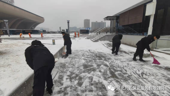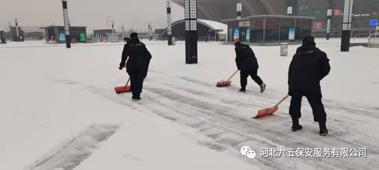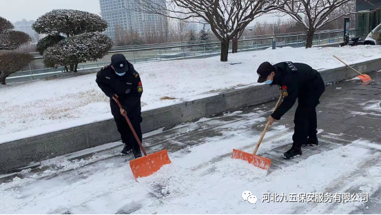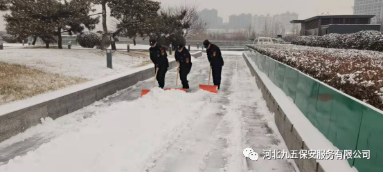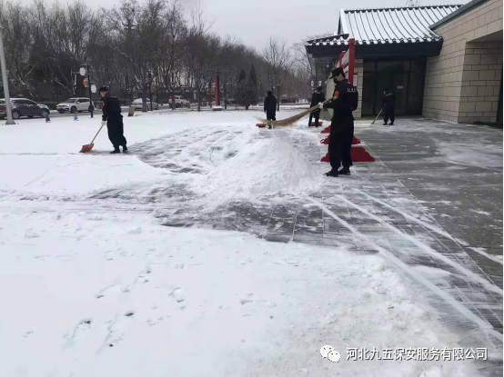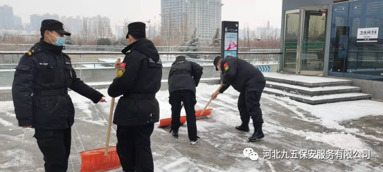 河北九五保安公司从下雪的那一刻起立即启动冰雪应急预案,公司领导精心组织,保安队长层层落实,全体保安员加入扫雪队伍,清理公共场地的道路积雪,为人们的雪天出行保驾护航。