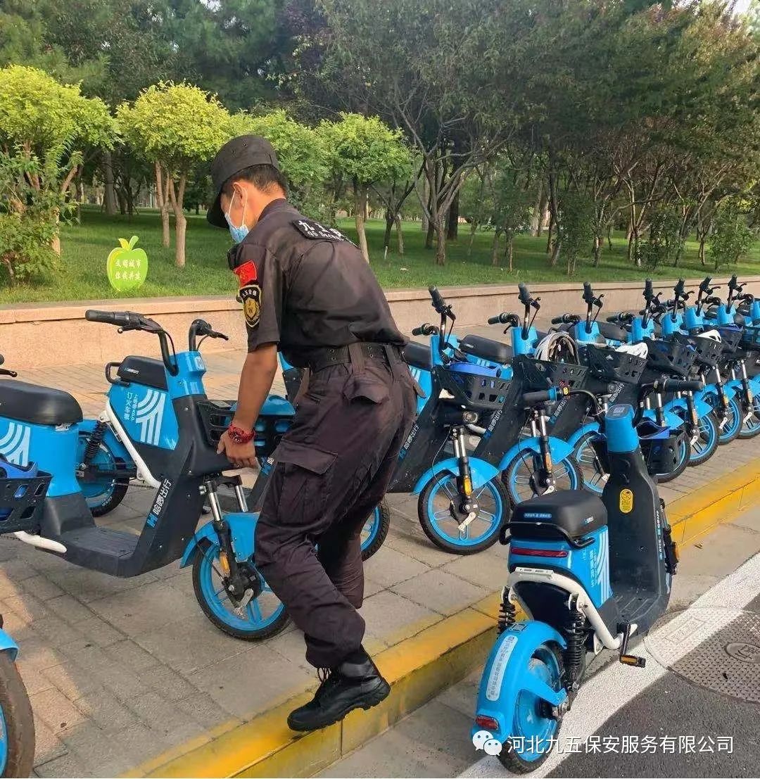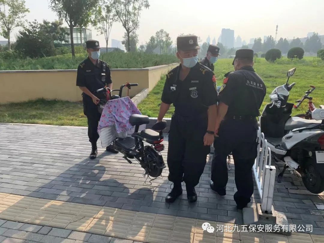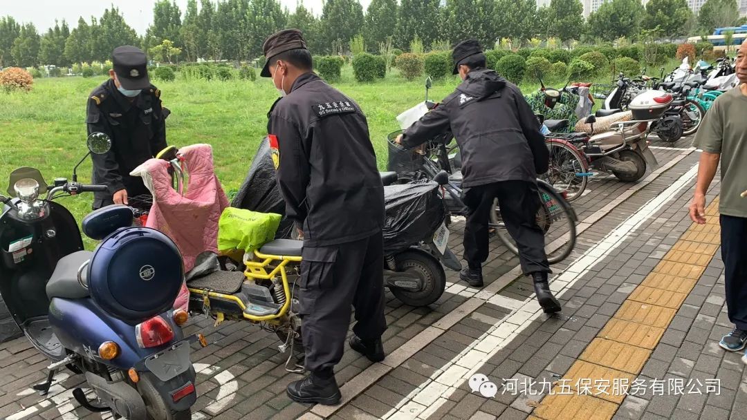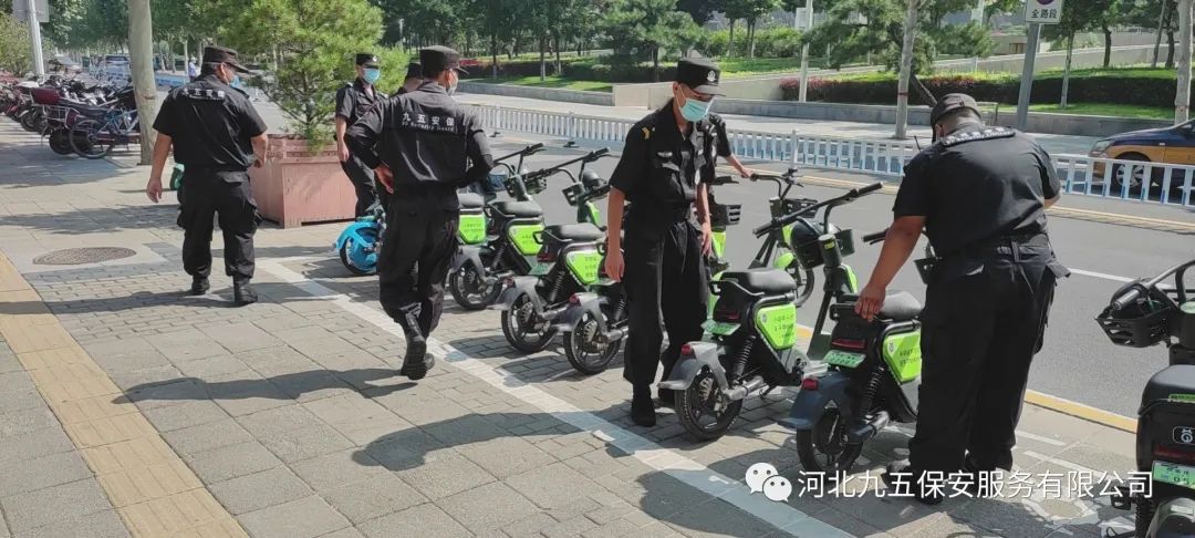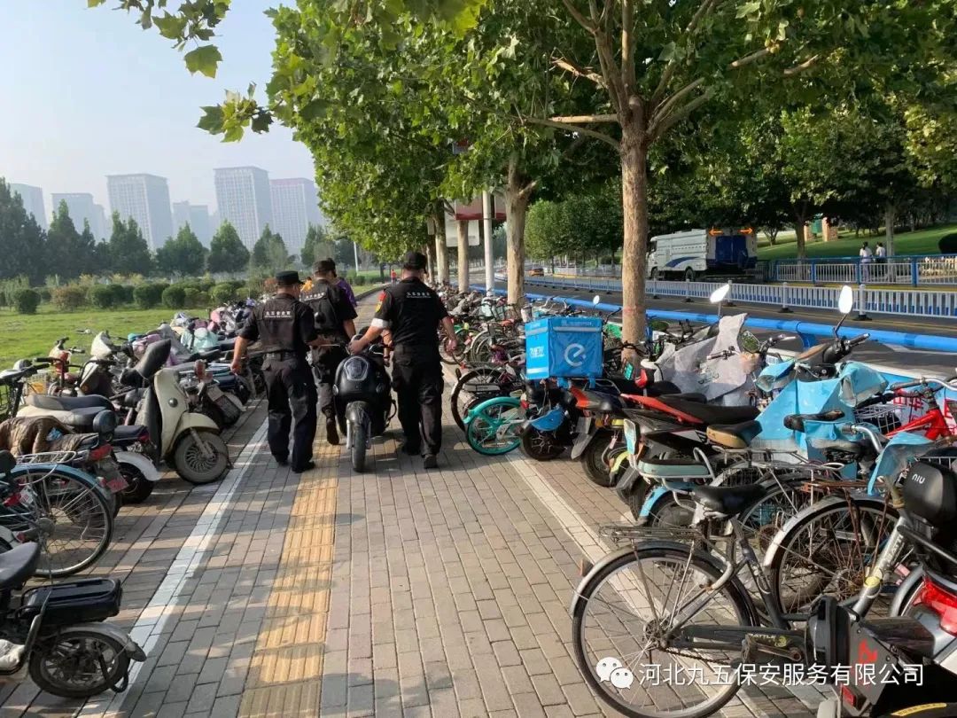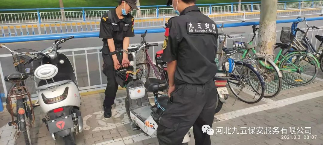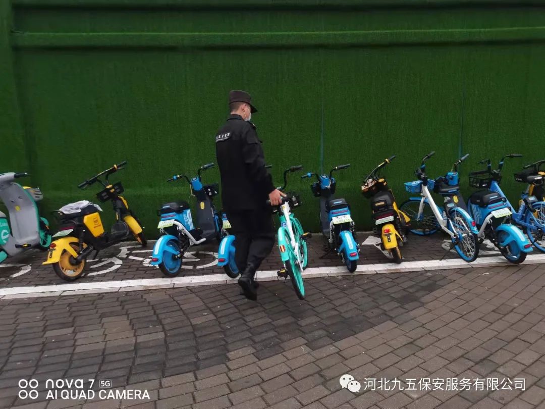 文明行驶,有序停放,九五保安克服酷暑天气,积极对责任区域内不断的巡查,规整摆放非机动车,劝阻非机动车辆乱停乱放等行为,为营造文明市容环境做出贡献。