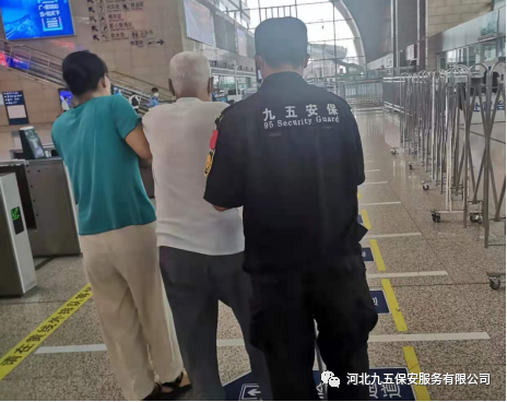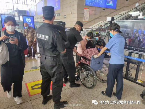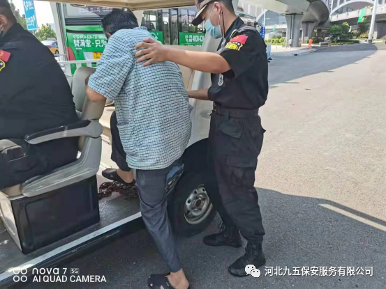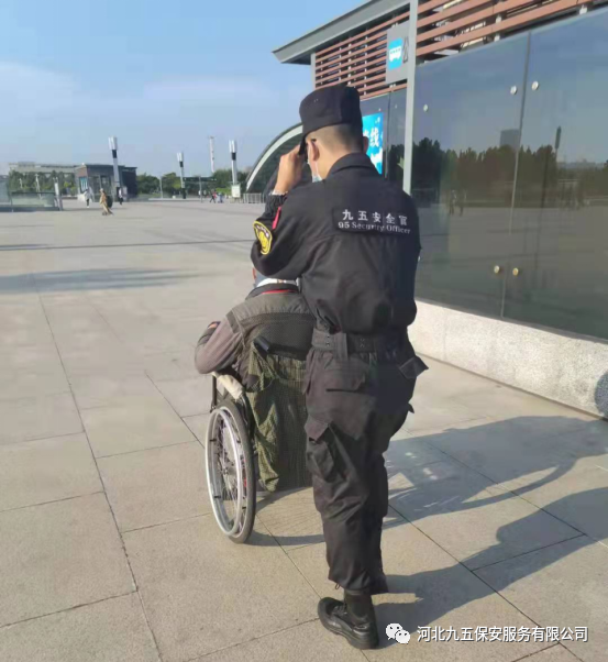九五保安帮助行动不便的人士并联系工作人员提供一辆轮椅