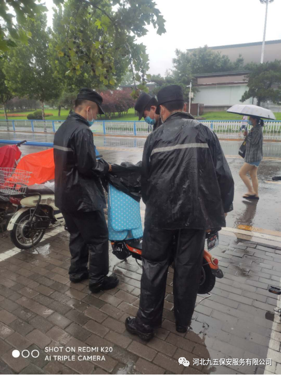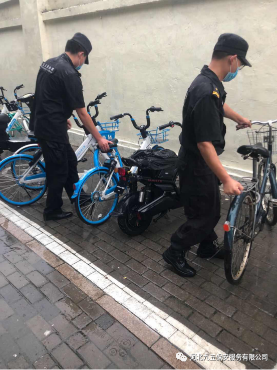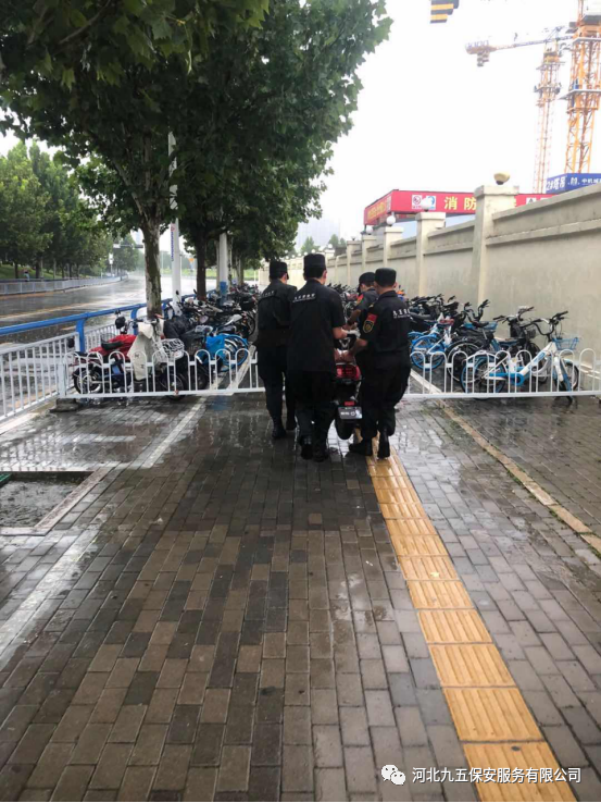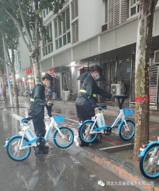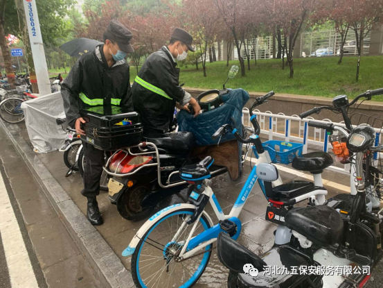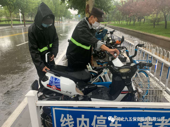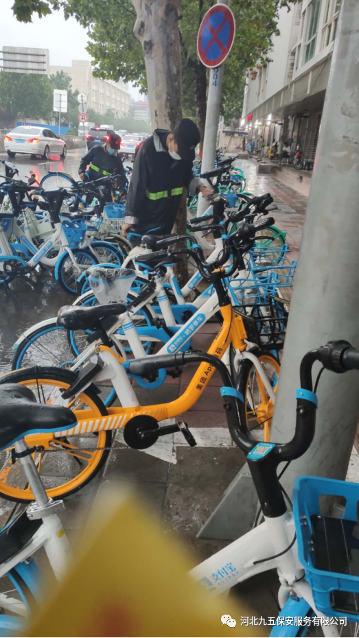 九五保安队员冒雨清理乱停乱放在马路边上的车辆和共享单车,将所有的车辆停放到指定的区域,为石家庄创建文明城市贡献一份力量。